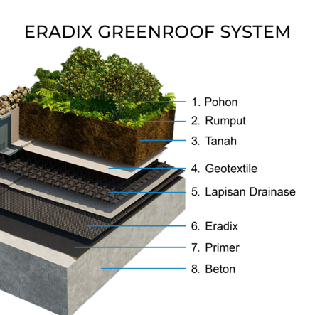Casali Eradix merupakan membran waterproofing yang berfungsi untuk mencegah pertumbuhan akar menembus struktur bangunan, ideal untuk taman atap. Casali Eradix Diperkuat lapisan bitumen, polypropylene, dan Preventol B2 dari Bayer yang melindungi struktur bangunan dari akar tanaman.